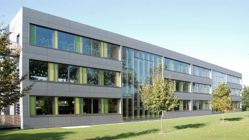 Neben der Erneuerung der Dach- und Fensterflächen erhielt die Schule eine Mineralfaser-Wärmedämmung mit vorgehängter, hinterlüfteter Bekleidung aus Faserzementplatten.