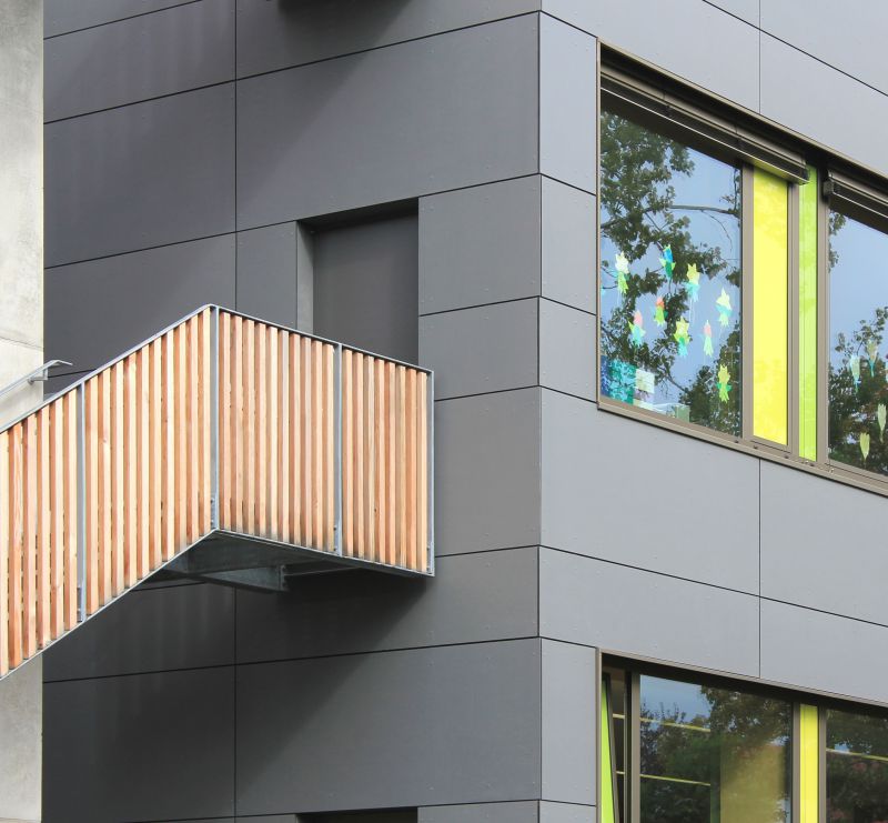 Aus dieser Haltung heraus, entschied man sich bewusst, die Materialität und Farbgebung der ursprünglichen Sichtbetonflächen gestalterisch als Maßgabe zu nehmen. Der graue Faserzement wird dieser Aufgabe in hervorragender Art und Weise gerecht. Farbige Glasfelder in den Bandfassaden spiegeln die kindgerechte Ausstattung und Farbgebung des Innenraumes wieder und übernehmen die Farbigkeit des daneben befindlichen Kinderhortes.